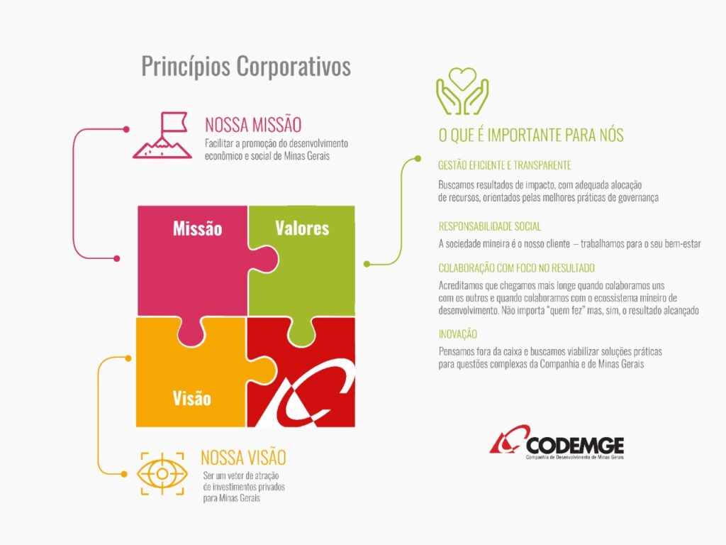 Todas as frentes de ação da Codemge em sua nova fase estão em consonância com o plano estratégico, que define diretrizes institucionais, objetivos e indicadores relacionados à atuação da Empresa entre 2023 e 2027. Nesse sentido, a Companhia tem como missão facilitar a promoção do desenvolvimento econômico e social em Minas Gerais. Sua visão corporativa é ser um vetor de atração de investimentos privados para o território mineiro.