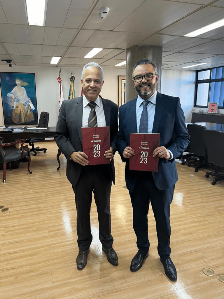 No dia 17 de junho, o presidente da Companhia de Desenvolvimento de Minas Gerais, Sérgio Cabral, participou de reunião no Tribunal de Contas do Estado de Minas Gerais (TCE-MG) e entregou ao presidente do órgão, Gilberto Pinto Monteiro Diniz, o Relatório de Gestão 2023 da Companhia.